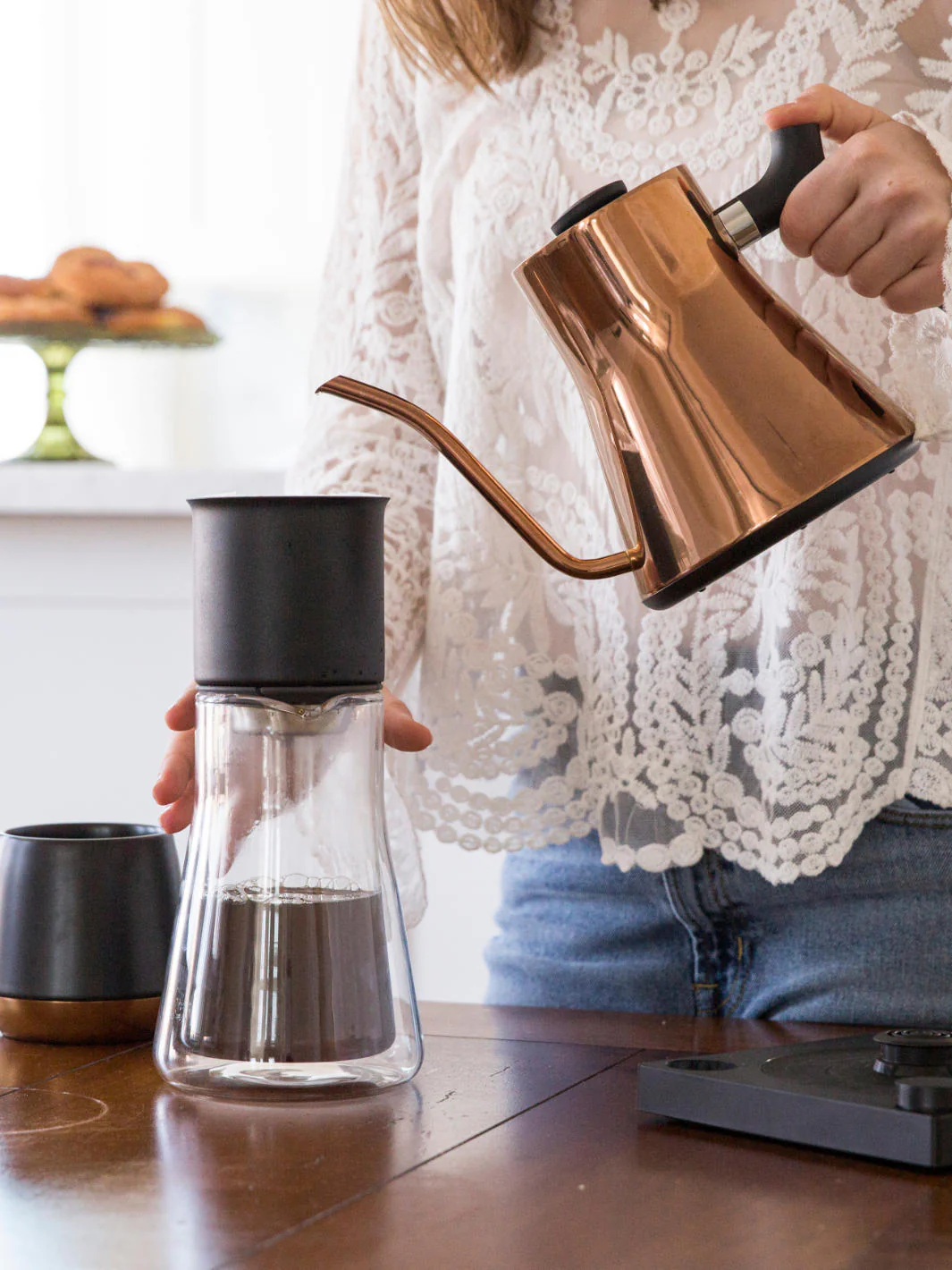 Recommended for 1-2 cup brews (600ml/20oz), the Stagg [XF] rests comfortably on Fellow drinkware and servers.